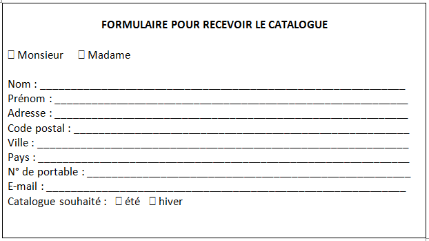 Vous voulez aller faire du ski en janvier. Vous faites une demande de catalogue à une agence de voyage. Vous remplissez ce formulaire.