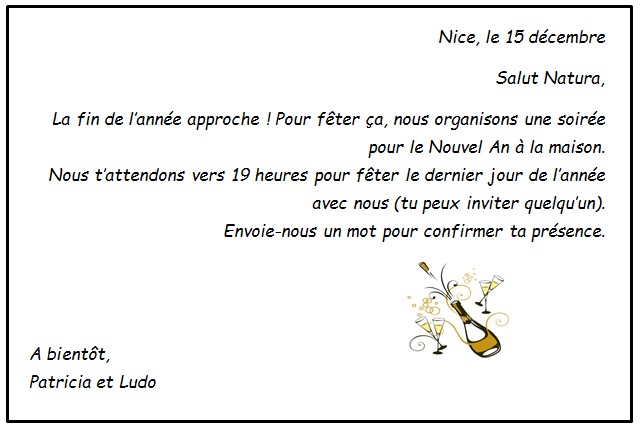 Vous êtes Natura. Vous répondez à vos amis Patricia et Ludo: vous acceptez l'invitation, vous donnez le nom de la personne qui va vous accompagner, vous proposez quelque chose (40 à 50 mots).