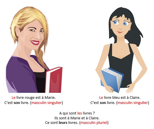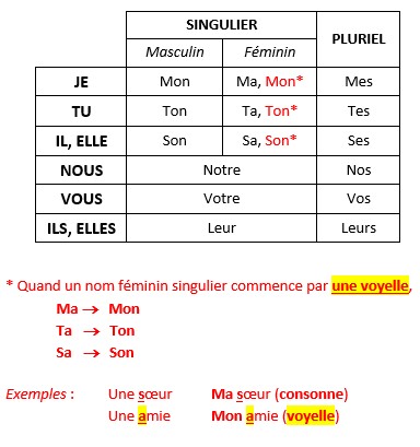 L'adjectif possessif s'accorde avec le nom (masculin, féminin / singulier, pluriel).