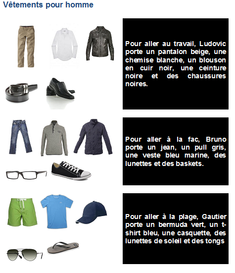 Apprenez tous les mots de vocabulaire sur les vêtements en français. Ici vous allez apprendre à décrire la tenue vestimentaire de quelqu’un.