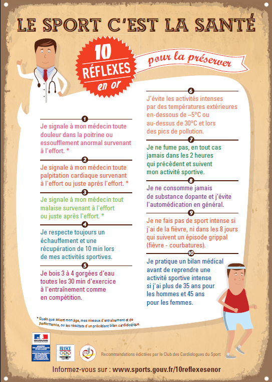 En 2013, une campagne publicitaire a été lancée par le Ministère des Sports, de la Jeunesse, de l’Education populaire et de la Vie associative et le Ministère des Affaires sociales et de la Santé pour informer les sportifs de tous niveaux des précautions à prendre avant de pratiquer une activité sportive.